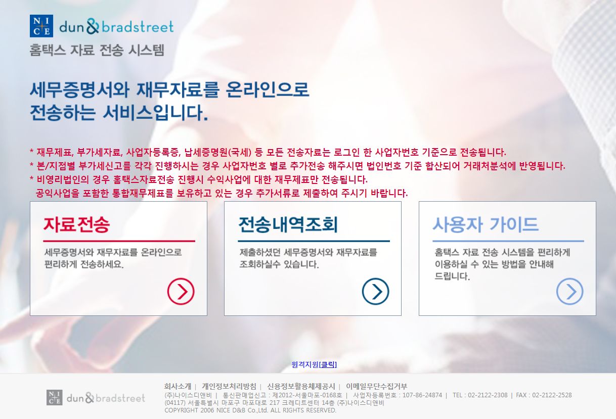 - * 재무제표, 부가세자료, 사업자등록증, 납세증명원(국세) 등 모든 전송자료는 로그인 한 사업자번호 기준으로 전송됩니다.