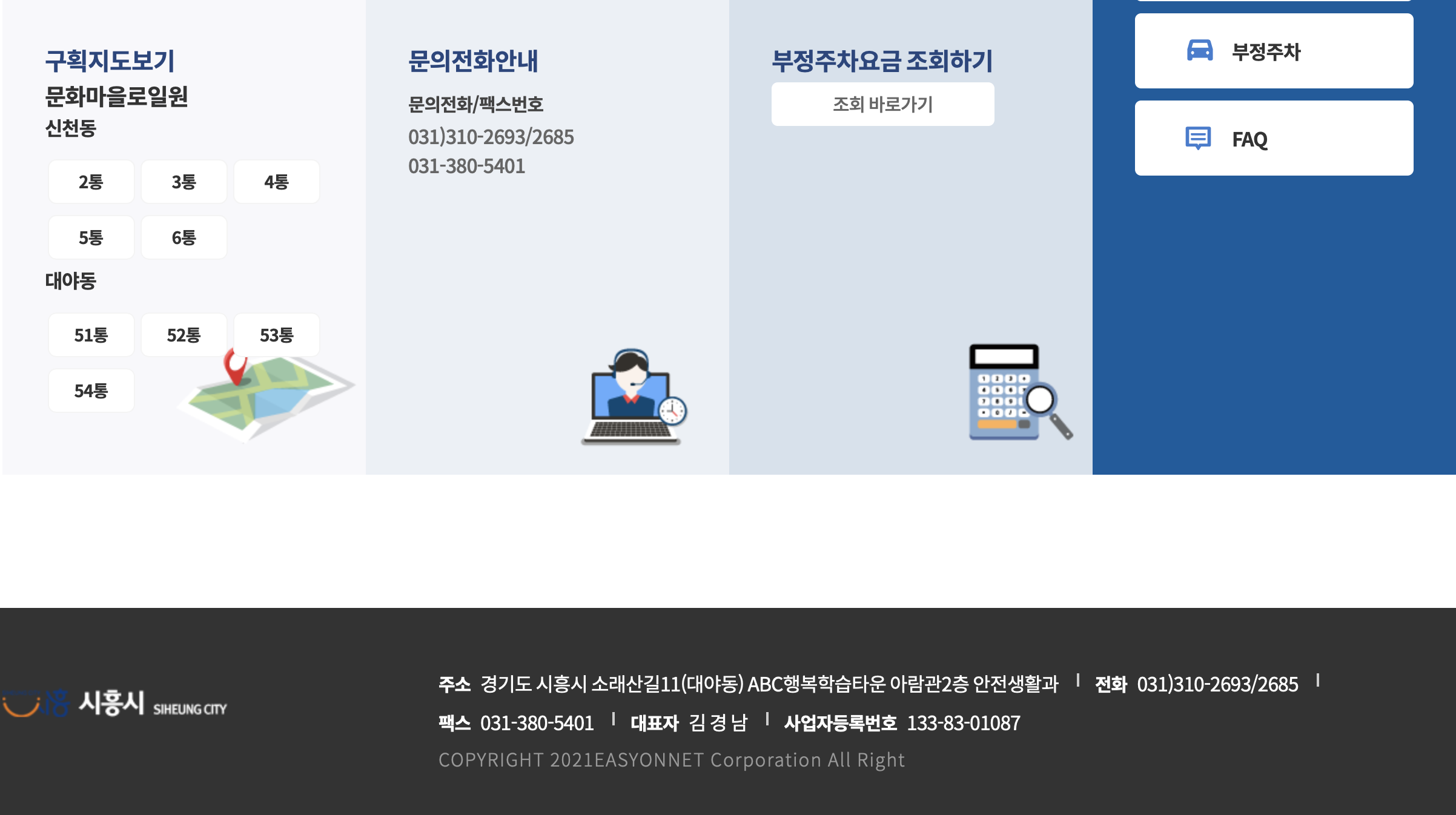 카테고리 없음 시흥시 대야 신천권 우선주차시스템 (http://park.siheung.go.kr) 나는A클래스 2022. 7. 27. 01:31 거주자 우선주차 페이지 시흥시 대야신천 거주자 우선주차 http://park.siheung.go.kr 시흥시 대야신천 거주자우선주차 park.siheung.go.kr 문의 전화안내 031) 310 - 2693 / 2685 031) 380 - 5401 공유하기 게시글 관리 iamAclassMan 저작자표시 (새창열림)