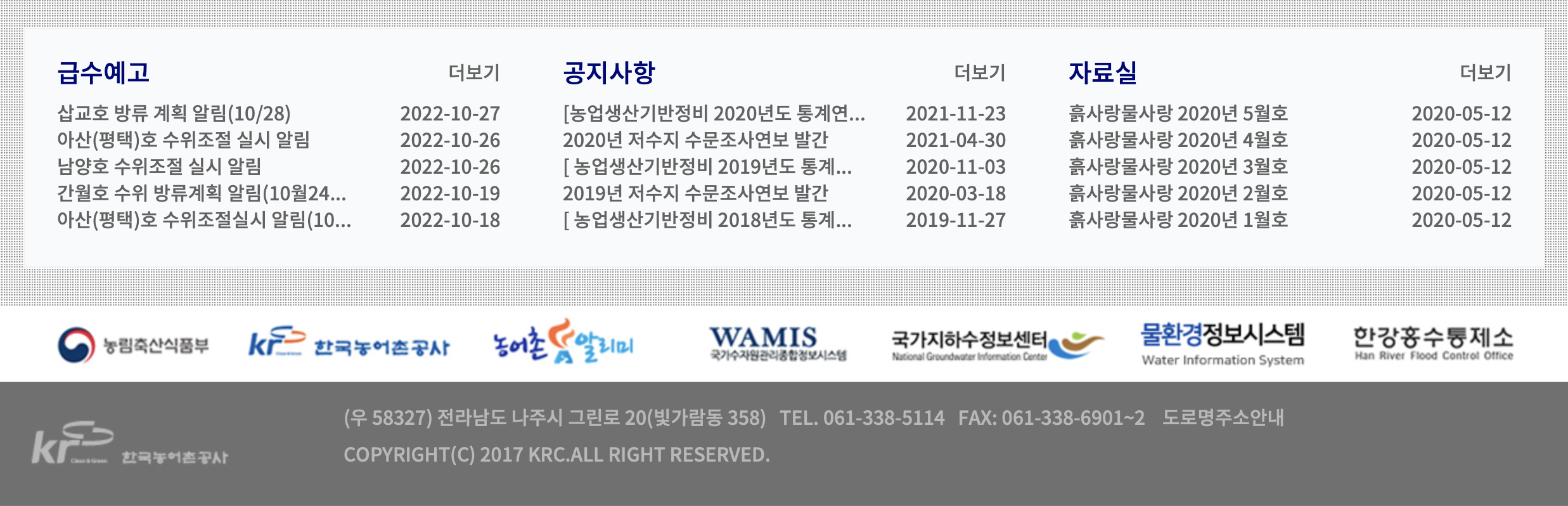 카테고리 없음 농촌용수종합정보시스템 (https://rawris.ekr.or.kr) 나는A클래스 2022. 10. 30. 11:55 농촌용수종합정보시스템 https://rawris.ekr.or.kr/main.do 농촌용수종합정보시스템 rawris.ekr.or.kr 전라남도 나주시 그린로 20 (빛가람동 358) TEL. 061-338-5114 공유하기 게시글 관리 iamAclassMan 저작자표시 (새창열림)