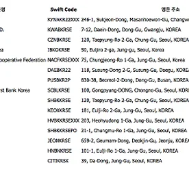 경남은행, 광주은행, 농협, 대구은행, 부산은행, 스탠다드차타드은행, 전북은행, 한국씨티은행까지 모두 다 있습니다. 이건 애드센스를 하시는 분들 뿐 아니라 해외 송금을 주고바든 분들에게 유용한 정보입니다. 은행명을 영문명으로도 확인할 수 있고바로 옆에 스위프트 코드도 있습니다. 이미지라서 잘 안보이시거나 복붙하시고 싶으신 분들을 위해 은행명영문명Swift Code영문 주소경남은행Kyongnam BankKYNAKR22XXX246-1, Sukjeon-Dong, Masanhoewon-Gu, Changwon-Si, Kyungsangnam-Do, KOREA광주은행The Kwangju Bank, LTD.KWABKRSE7-12, Daein-Dong, Dong-Gu, Gwangju, KOREA국민은행Kookmin Ba..